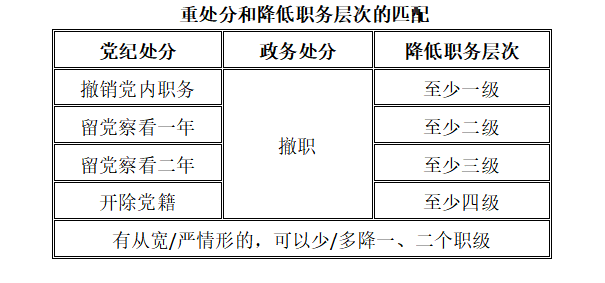 2.对拟给予撤职处分的党员干部,应按照拟给予其党纪重处分的不同档次,即撤销党内职务、留党察看一年、留党察看二年和开除党籍等四档,由轻及重,区别对待,分别提出降低至少一个至四个职务层次的建议。降低职级的幅度应当综合考虑职务层次和职级之间的对应关系,调整后的职级一般应当为调整后相应职务层次所对应的最低职级。对适用从宽或者从严把握情形的,可以少降或者多降一至二个职级。