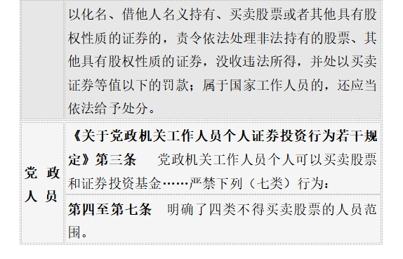 2.禁止情形和负面清单主要包括七类行为、四类对象。“违反有关规定从事营利活动”意味着《纪律处分条例》和《政务处分法》本身并未对禁止事项和行为作出详细规定,需要援引相关党规国法的规定。根据《证券法》和《关于党政机关工作人员个人证券投资行为若干规定》的规定,