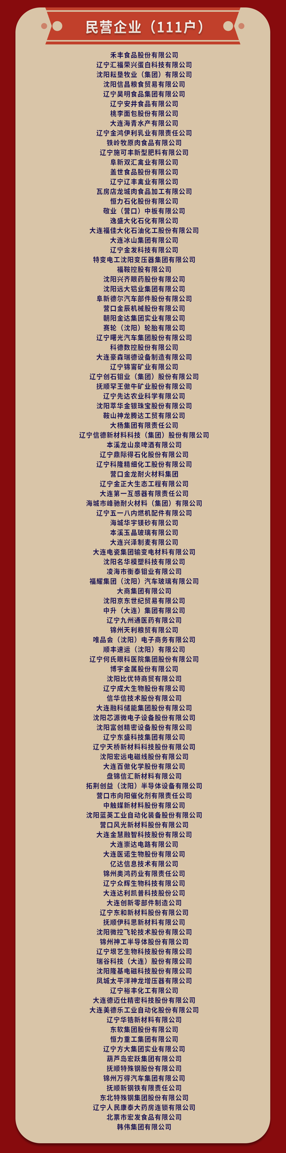 为进一步调动广大企业助力辽宁全面振兴的积极性、主动性、创造性,提振信心、激发干劲,鼓励和支持各类企业竞相发展,省委省政府决定,对在全面振兴新突破三年行动攻坚之年作出突出贡献的241户企业予以通报表扬。具体名单如下。